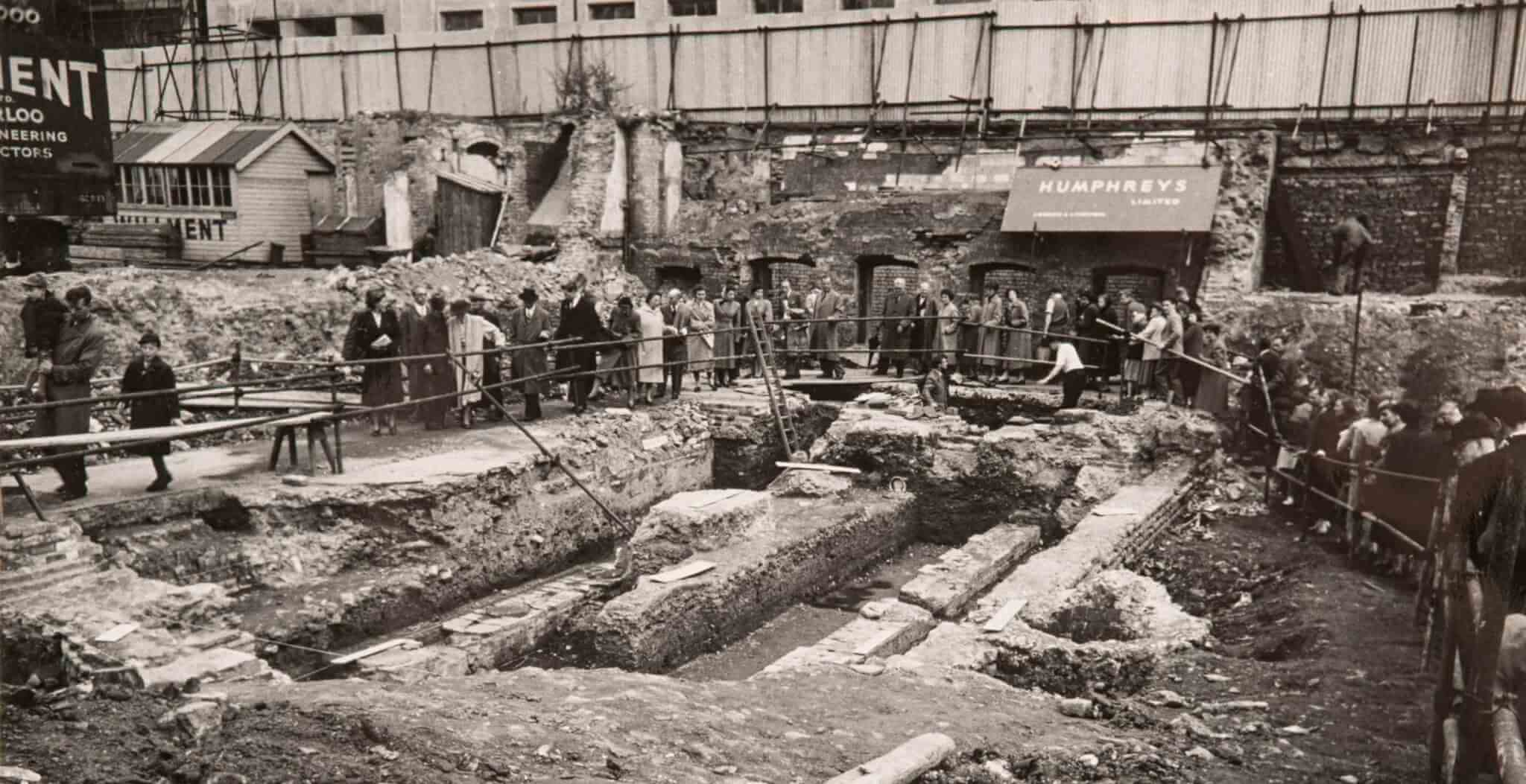 During World War II when German bombs dropped on this part of the City and blew enormous holes in the ground, parts of Roman London which had been lost were rediscovered. While a bomb site was being excavated in 1954, a Roman Temple dedicated to the god Mithras was discovered in Walbrook.