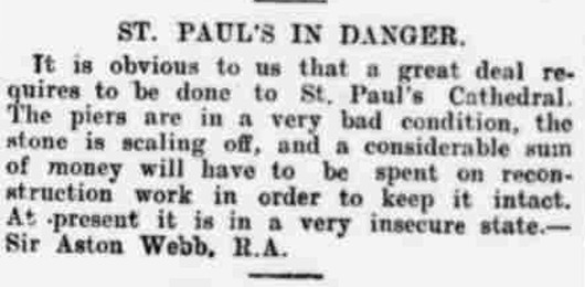 On Christmas Eve, 1924, the Dean and Chapter of St Paul's Cathedral received what's come to be known as the 'Citys Christmas Present', although it wasn't a welcome gift at the time. It took the form of a Dangerous Structures Notice from the City of London's Surveyor and warned the Cathedral authorities that unless immediate work was carried out the safety of the dome and those below it could not be guaranteed. Worst case scenario, the crowning glory of Sir Christopher Wren's English Baroque masterpiece, and an iconic presence on the London skyline, could collapse!
