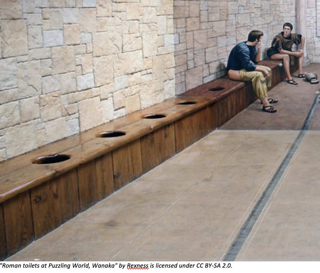 This image of a Roman toilet provides an idea of what it would have been like. No cubicles like today, but a long big plank with lots of holes in it. So you just sat next to your neighbour while you did your business.